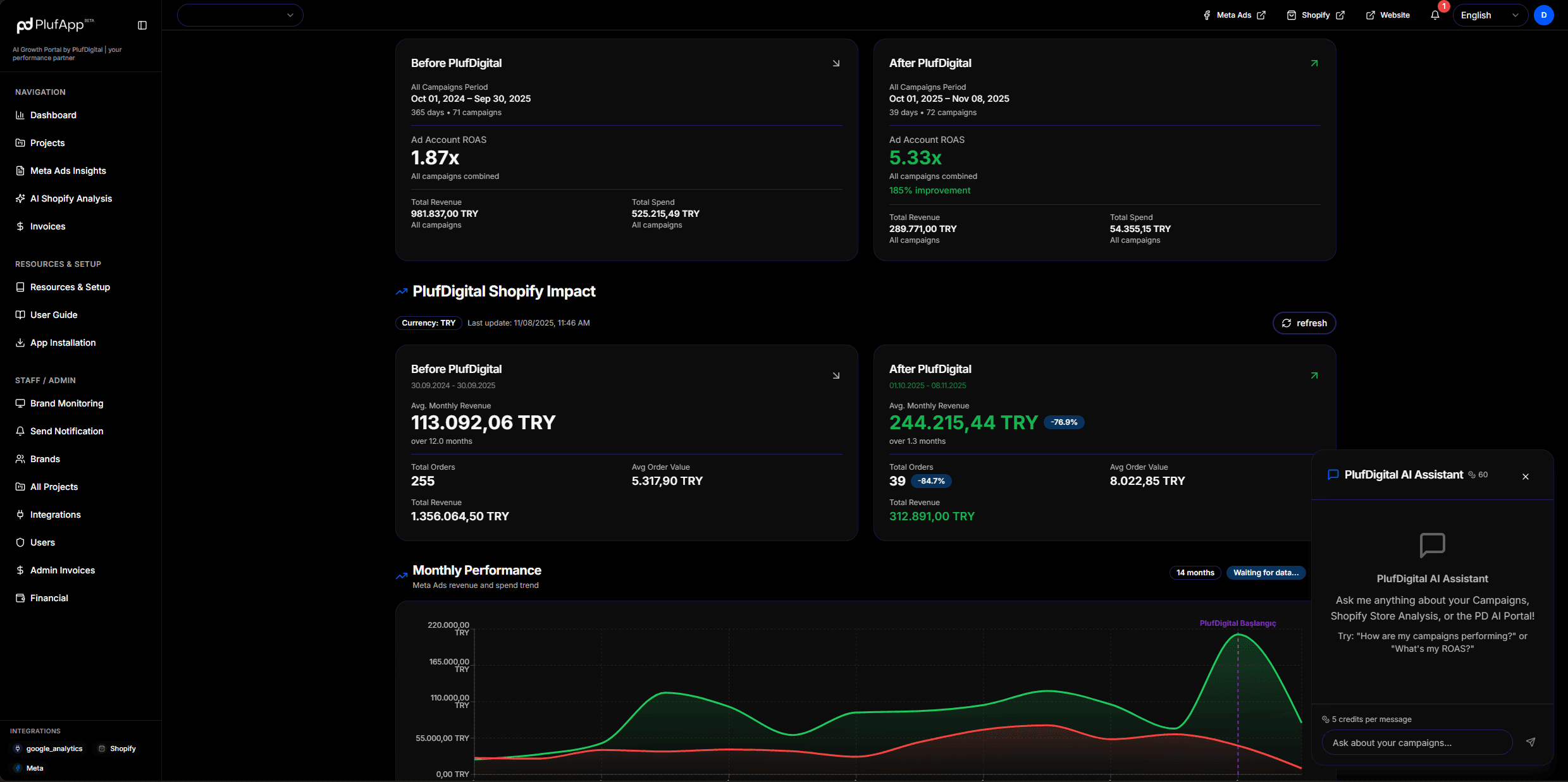 PlufApp unifies your Shopify, Meta, and GA4 data, automatically analyzes KPI shifts, and provides clear performance insights. All actions are logged, their results are visualized with comparative charts, and the AI generates recommendations for the next step. This eliminates the question “What’s going on?” Everything becomes transparent, simple, and fully trackable.