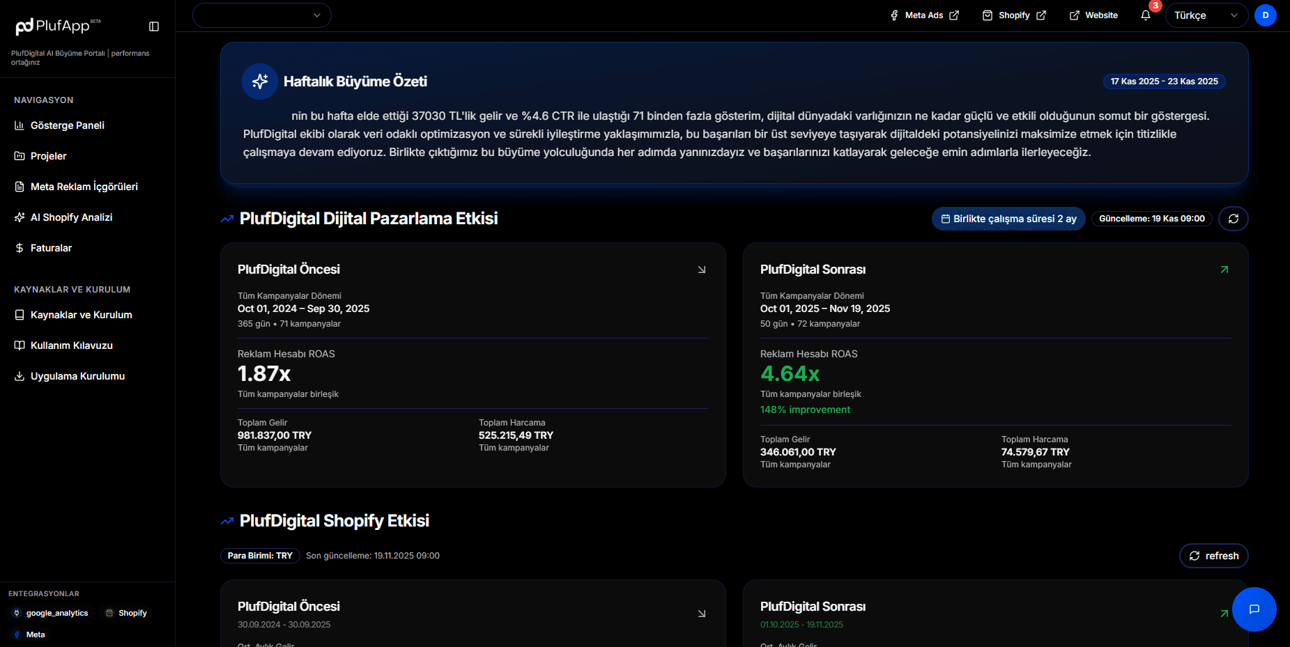 PlufApp, Meta, Shopify ve GA4 verilerinizi tek bir panelde birleştiren, performansınızı analiz eden, AI destekli eylem önerileri sunan ve kampanya optimizasyonlarına dayalı olarak sonraki adımları planlayan bir akıllı büyüme platformudur.