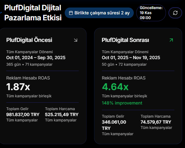 PlufDigital ile iş birliği öncesi ve sonrası kampanyaların performansını karşılaştırın.